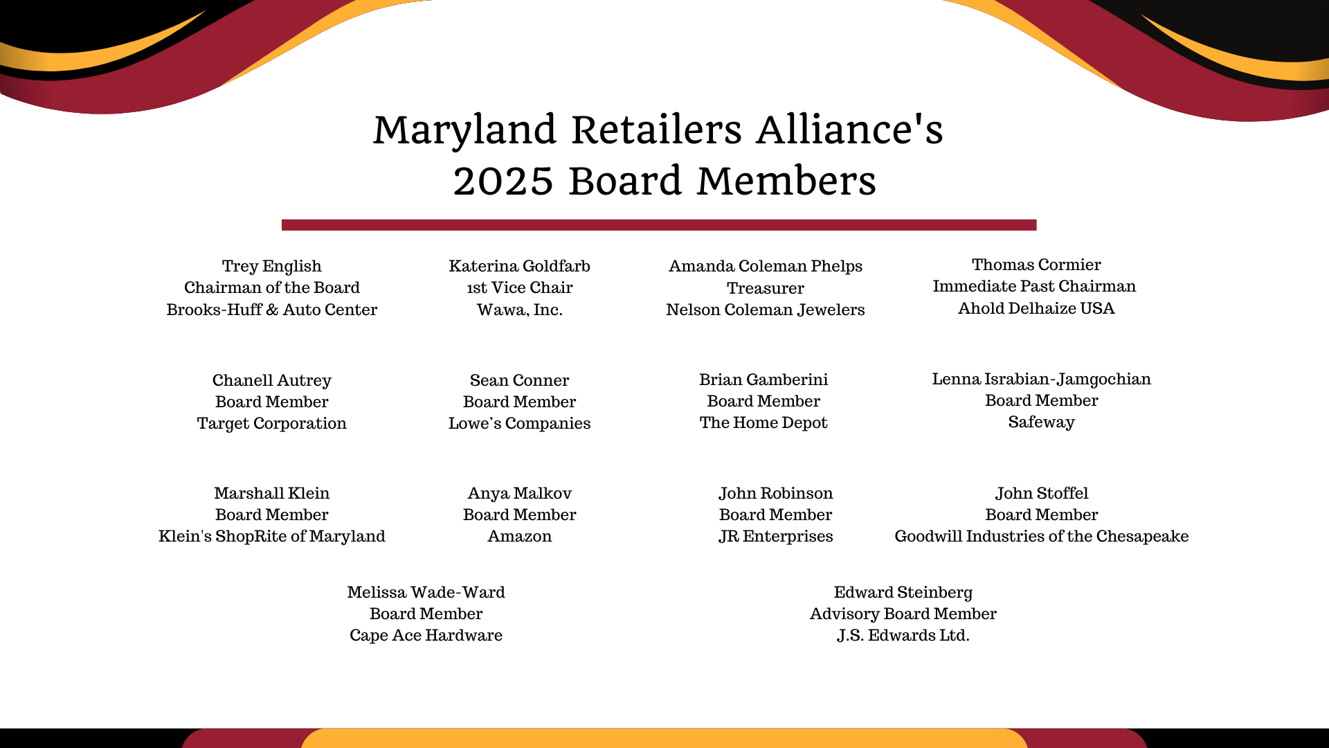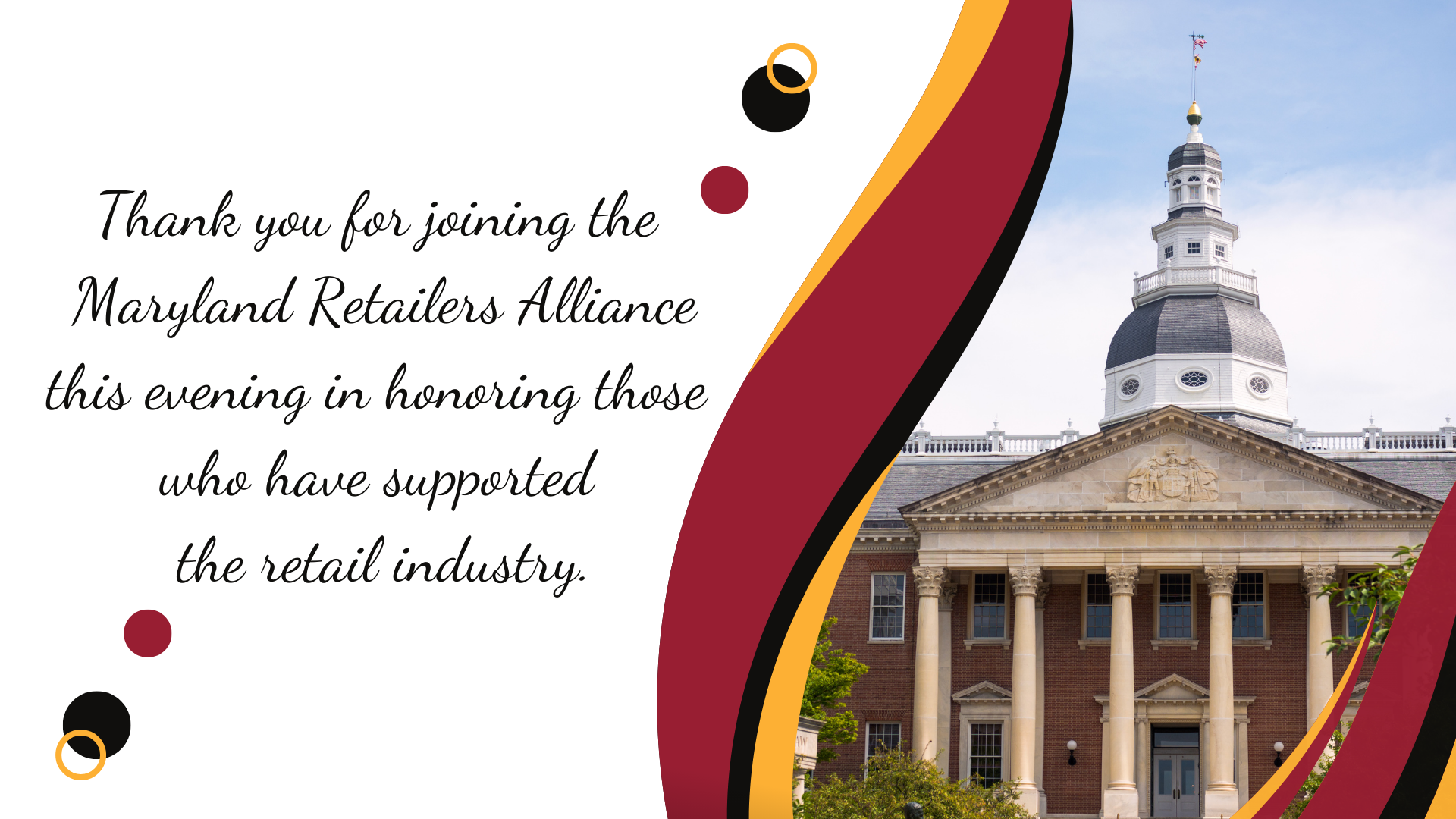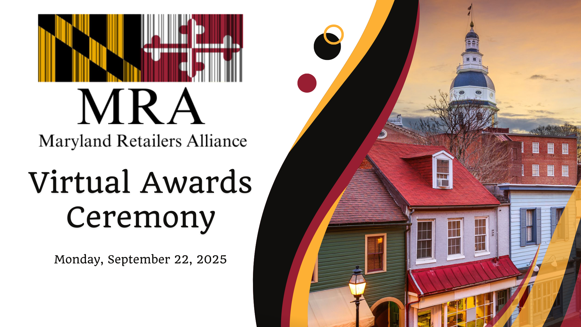 The Maryland Retailers Alliance Annual Awards are presented at our Annual Meeting and Awards Ceremony each Fall. The Annual Awards Event is our opportunity to thank our members and our legislative partners for all of the work that they do to support the mission of the MRA. This annual event is virtually streamed to showcase our awards program and a musical performance organized by our partners at BMI.