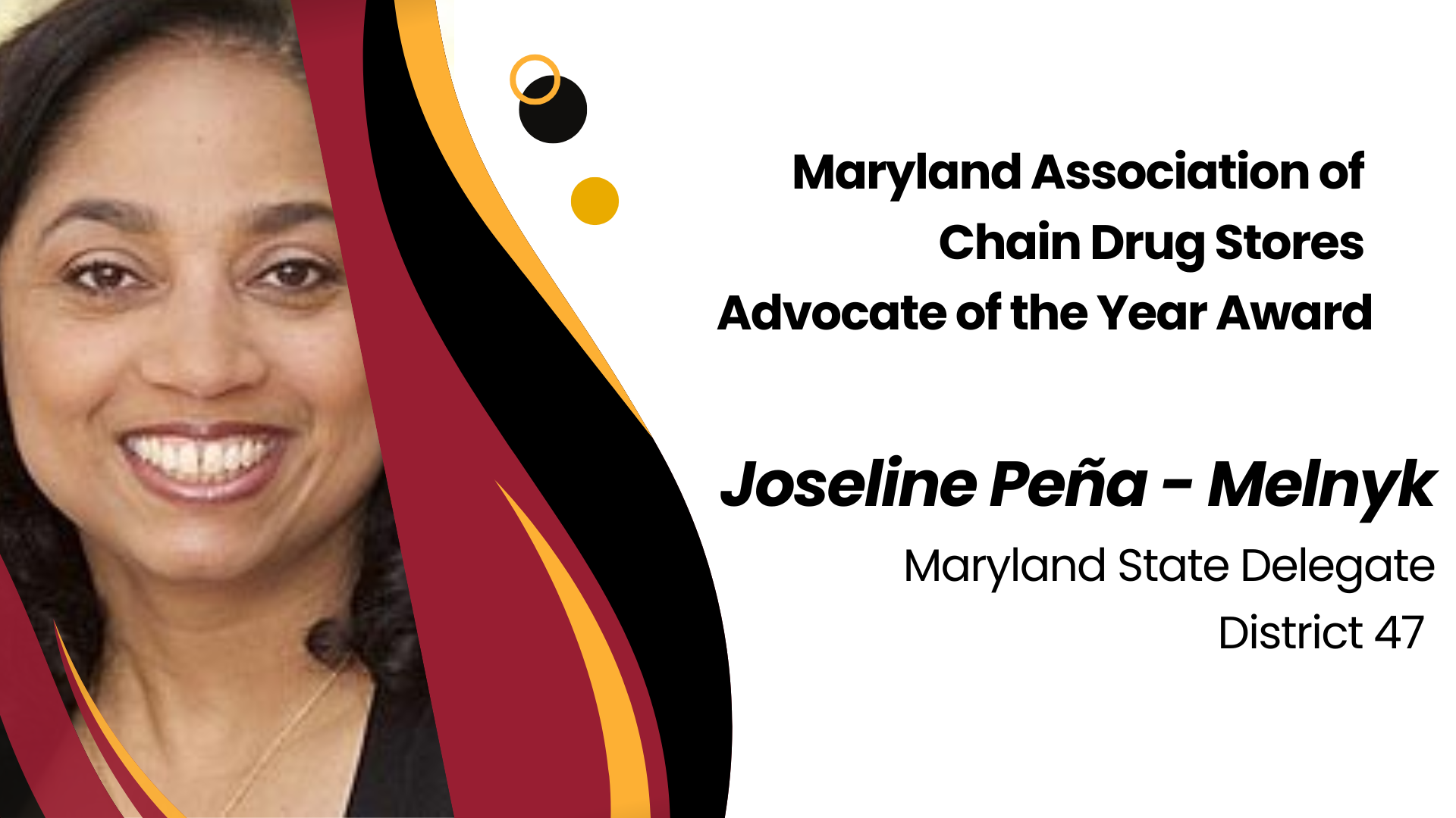 The Maryland Association of Chain Drug Stores Advocate of the Year Award is presented annually to an elected official in recognition of their outstanding public leadership and support of the mission of the Maryland Association of Chain Drug Stores.
