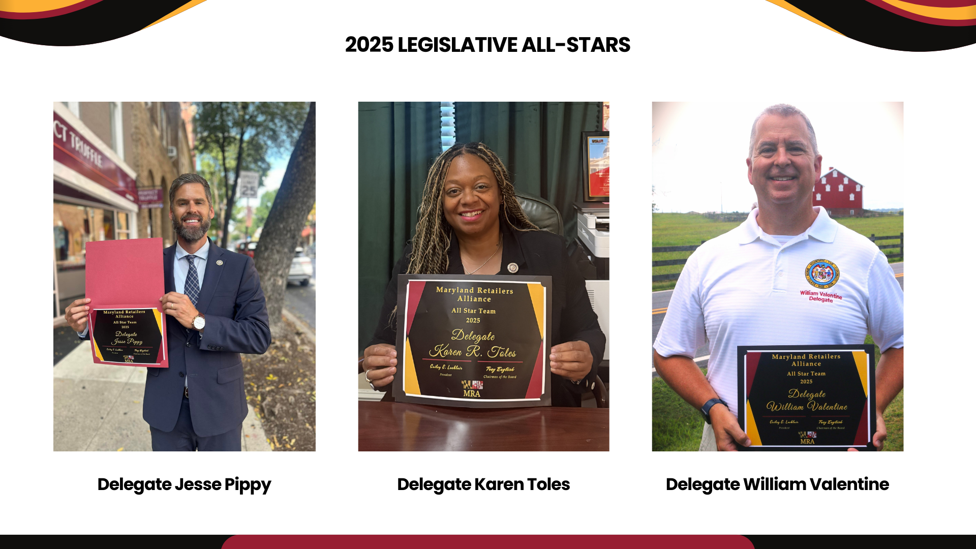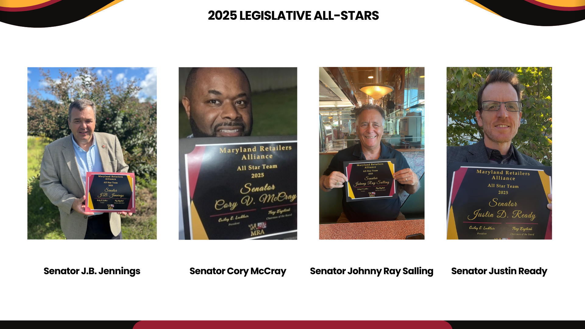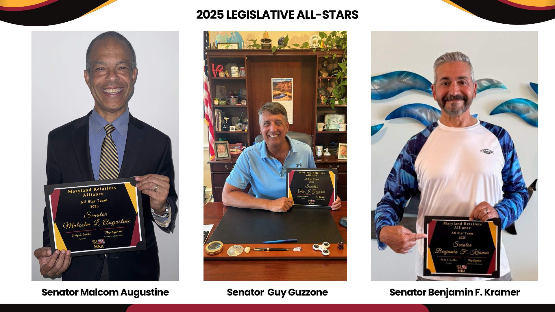 The MRA Legislator of the Year Award is presented annually to an elected official in recognition of their outstanding public leadership and support of the mission of the Maryland Retailers Association.